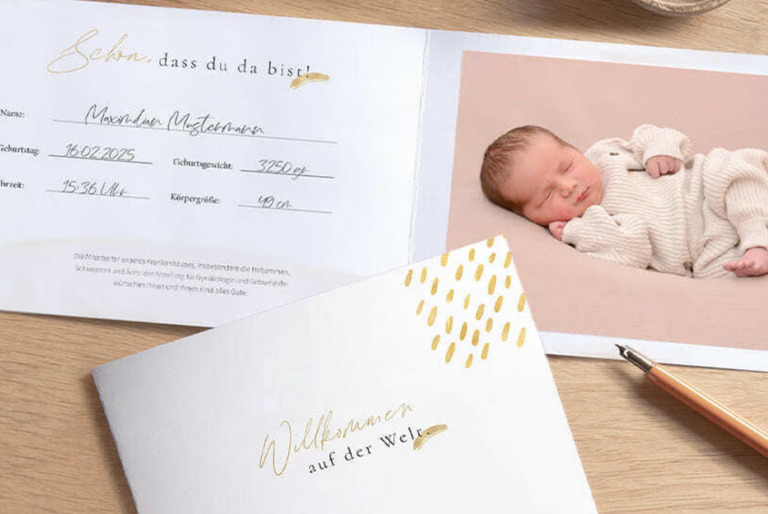 Mit der Glückwunschkarte heißt eure Geburtsklinik euer Baby herzlich willkommen. Aus besonderem Dank für euer Vertrauen erhaltet ihr ein liebevoll, von unserer Babyfotografin aufgenommenes Bild. Zusätzlich befinden sich die Geburtsdaten eures Babys in einer hochwertigen Glückwunschkarte.